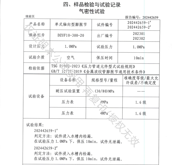 金屬波紋管(膨脹節(jié))氣密性試驗 結論無泄漏