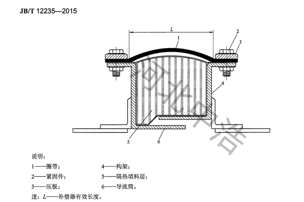 d---------壓板,壓板采用不銹鋼壓板,將圈帶與螺栓緊密連接 ,使其無泄漏 e----------------導(dǎo)流筒,采用加厚不銹鋼,降低直接磨損,增強疲勞次數(shù) f-------------隔熱填料層,加入陶瓷纖維、硅酸鋁和巖棉等,對非金屬補償器起到隔熱作用,降低熱傳遞和適當(dāng)防塵效果。