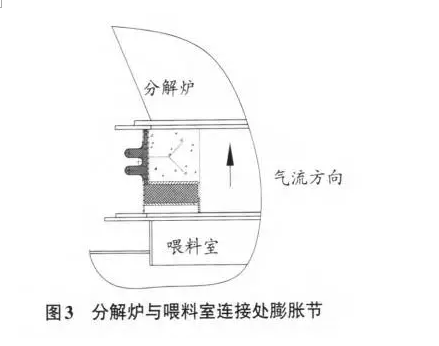(3) 分解爐與喂料室連接處膨脹節(jié) 。 分解爐與喂料室連接處膨脹節(jié)見圖 3 。此處比較特殊,也是容易出現(xiàn)問題的地方。通常理解為,此處連接喂料室與分解爐,來自喂料室的高速氣流通過膨脹節(jié)進入上部分解爐,對膨脹節(jié)使用影響的是氣流,膨脹節(jié)應該與圖 2 安裝方向相同。