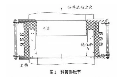 。由于料管上有起到通斷作用的鎖風閥,熱風被截斷,物料是管道的介質(zhì)。因此,只要_膨脹節(jié)按照物料流動方向安裝,內(nèi)部巖棉會受到很好的保護,膨脹節(jié)很少失效。除此之外,還要注意內(nèi)筒下部跟澆注料之間的間隙控制,間隙太小會影響內(nèi)筒移動,引起膨脹節(jié)失效。間隙太大,對巖棉保護不利。